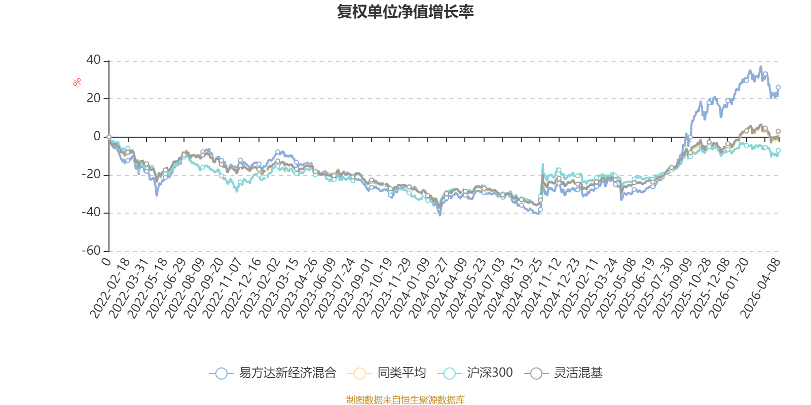 截至4月8日,易方达新经济混合近三个月复权单位净值增长率为-1.39%,位于同类可比基金828/1287;近半年复权单位净值增长率为8.41%,位于同类可比基金338/1286;近一年复权单位净值增长率为88.03%,位于同类可比基金122/1286;近三年复权单位净值增长率为45.82%,位于同类可比基金174/1286。