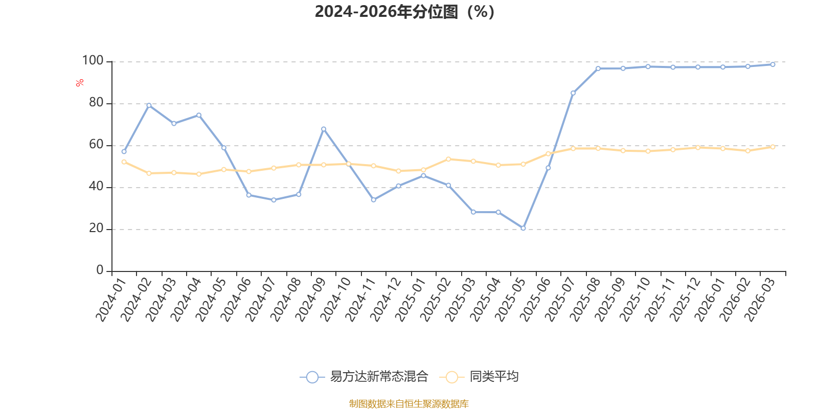 通过所选区间该基金净值增长率分位图,可以观察该基金与同类基金业绩比较情况。图为坐标原点到区间内某时点的净值增长率在同类基金中的分位数。