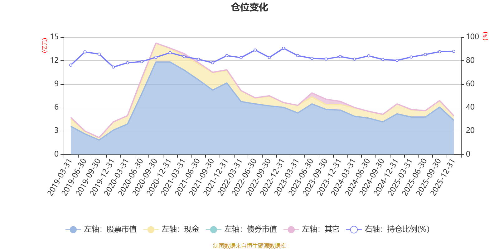 据定期报告数据统计,近三年平均股票仓位为83.59%,同类平均为72.57%。2022年末基金达到90.7%的最高仓位,2019年末最低,为74.64%。