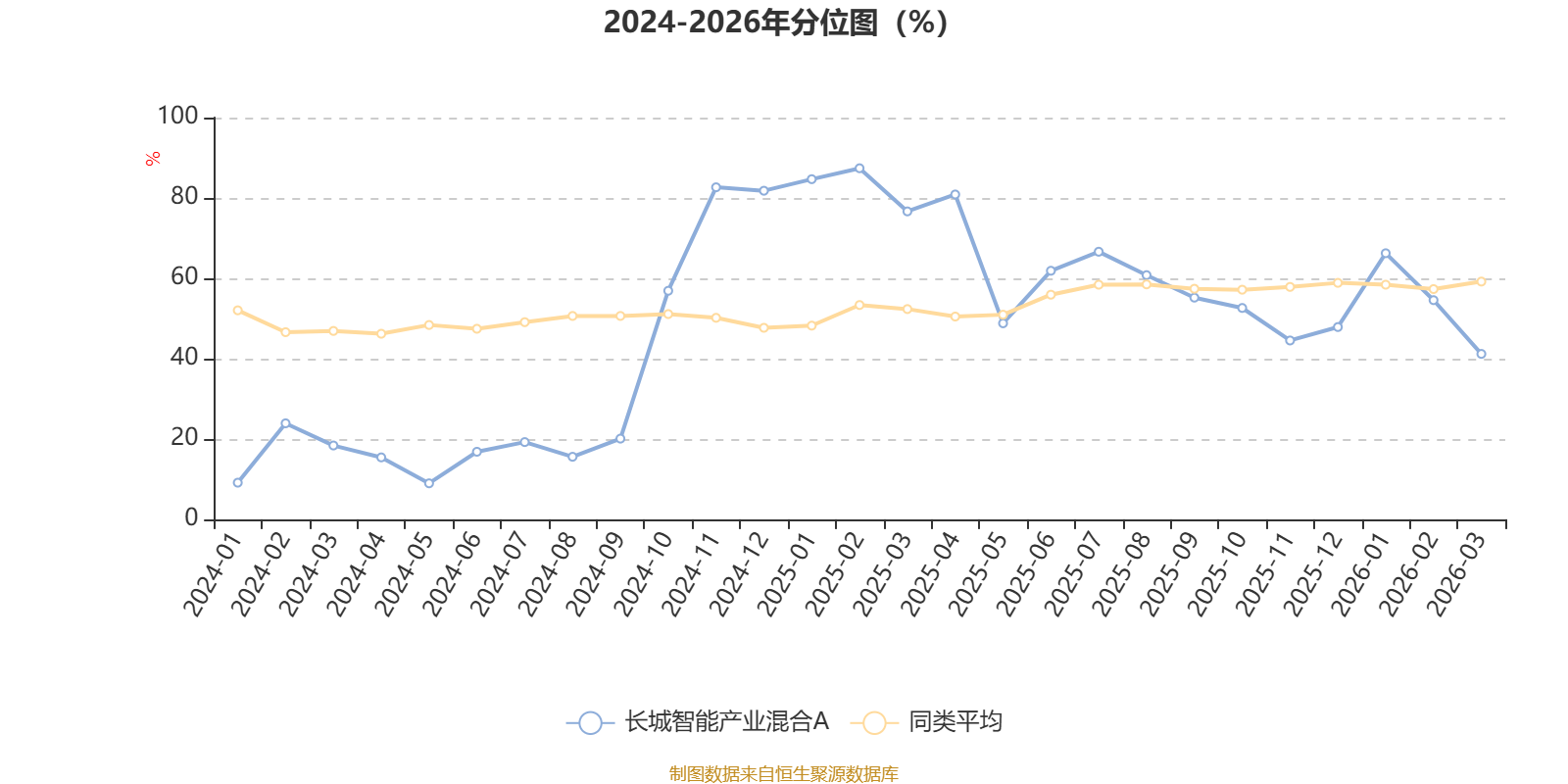 通过所选区间该基金净值增长率分位图,可以观察该基金与同类基金业绩比较情况。图为坐标原点到区间内某时点的净值增长率在同类基金中的分位数。