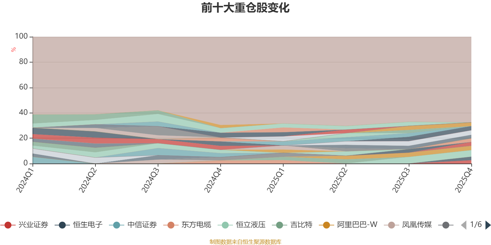 截至2025年末,基金十大重仓股分别是恒立液压、双环传动、阿里巴巴-W、中航沈飞、宁波银行、工业富联、腾讯控股、恒生电子、东方财富、兴业证券。