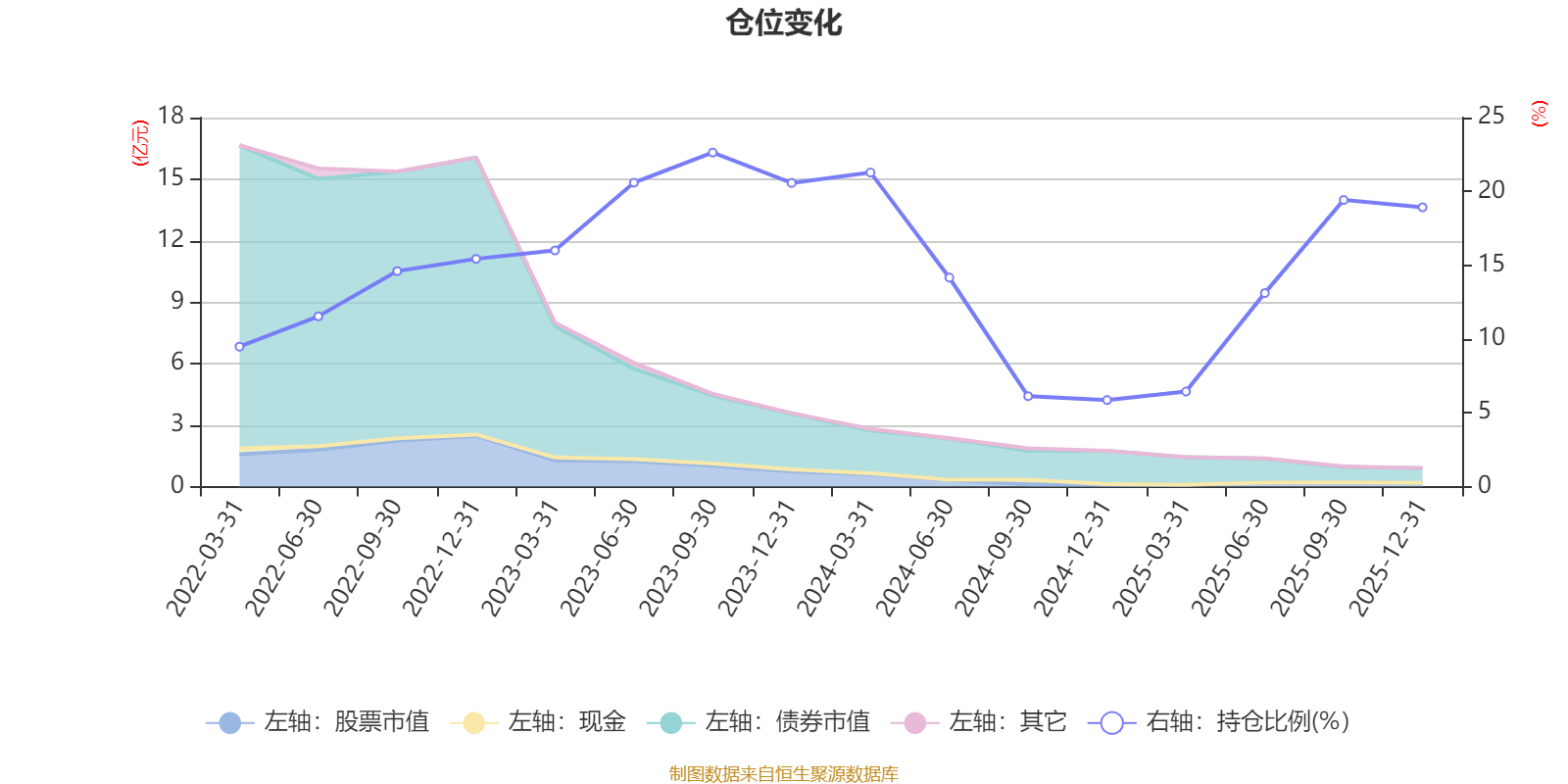 据定期报告数据统计,近三年平均股票仓位为15.43%,同类平均为19.2%。2023年三季度末基金达到22.63%的最高仓位,2024年末最低,为5.86%。
