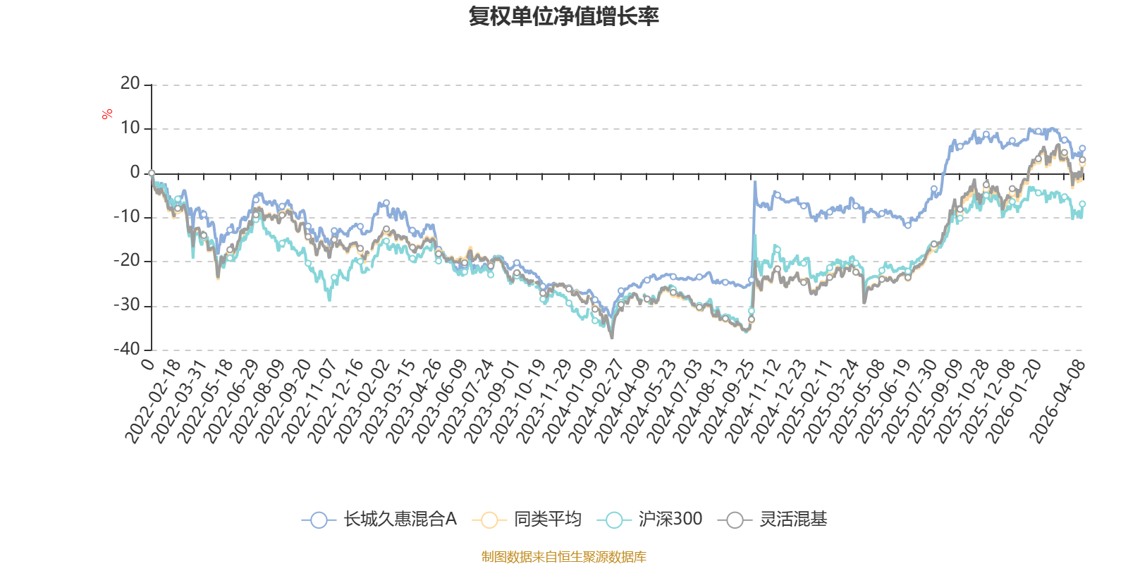 截至4月8日,长城久惠混合A近三个月复权单位净值增长率为-3.43%,位于同类可比基金987/1287;近半年复权单位净值增长率为-3.08%,位于同类可比基金1022/1286;近一年复权单位净值增长率为17.11%,位于同类可比基金949/1286;近三年复权单位净值增长率为19.30%,位于同类可比基金511/1286。