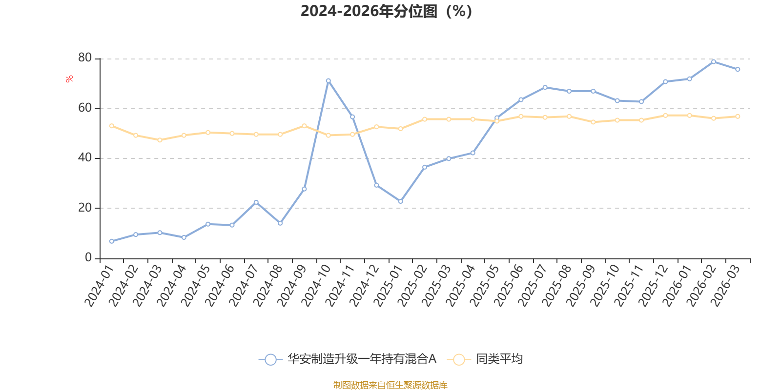 通过所选区间该基金净值增长率分位图,可以观察该基金与同类基金业绩比较情况。图为坐标原点到区间内某时点的净值增长率在同类基金中的分位数。