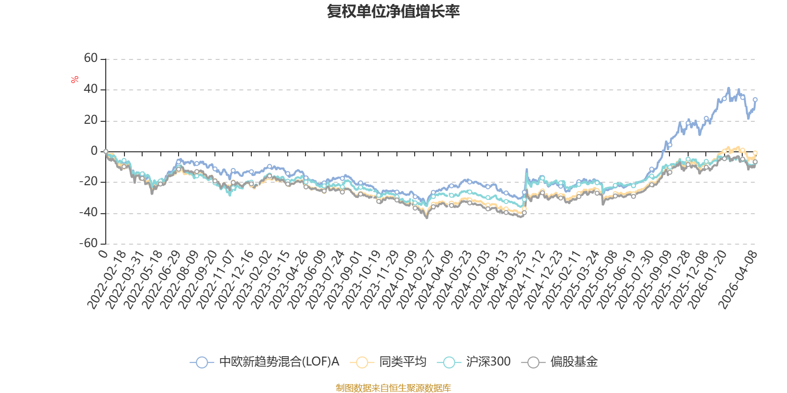 截至4月8日,中欧新趋势混合(LOF)A近三个月复权单位净值增长率为1.31%,位于同类可比基金48/130;近半年复权单位净值增长率为14.22%,位于同类可比基金12/130;近一年复权单位净值增长率为84.29%,位于同类可比基金13/130;近三年复权单位净值增长率为51.90%,位于同类可比基金11/126。