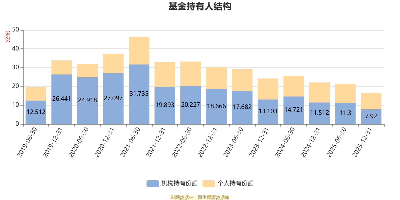 截至2025年12月31日,基金持有人共计15.52万户,合计持有16.59亿份。其中管理人员工持有1312.15万份,占比0.79%,机构持有份额占比47.74%,个人投资者占比52.26%。
