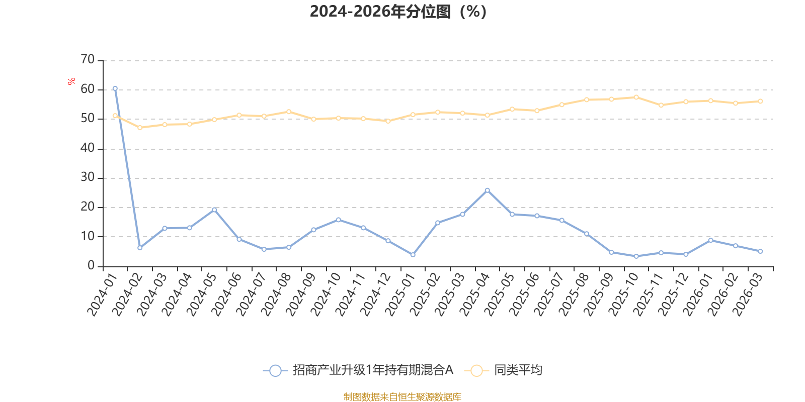 通过所选区间该基金净值增长率分位图,可以观察该基金与同类基金业绩比较情况。图为坐标原点到区间内某时点的净值增长率在同类基金中的分位数。