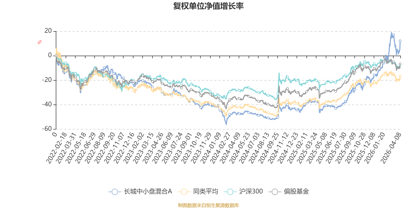 截至4月8日,长城中小盘混合A近三个月复权单位净值增长率为25.37%,位于同类可比基金5/621;近半年复权单位净值增长率为45.16%,位于同类可比基金4/621;近一年复权单位净值增长率为110.66%,位于同类可比基金22/618;近三年复权单位净值增长率为50.62%,位于同类可比基金63/559。