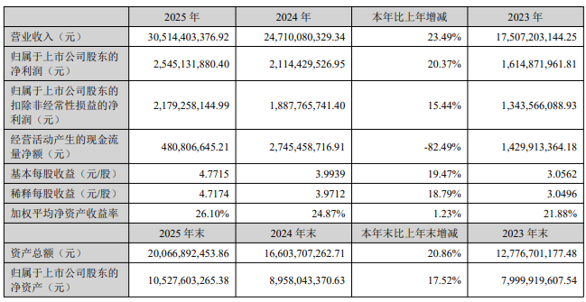近三年,安克创新营业收入从2023年的175.07亿元增至2025年的305.14亿元,归母净利润从16.15亿元增至25.45亿元,营收与利润复合增长率分别达32.01%、25.53%。