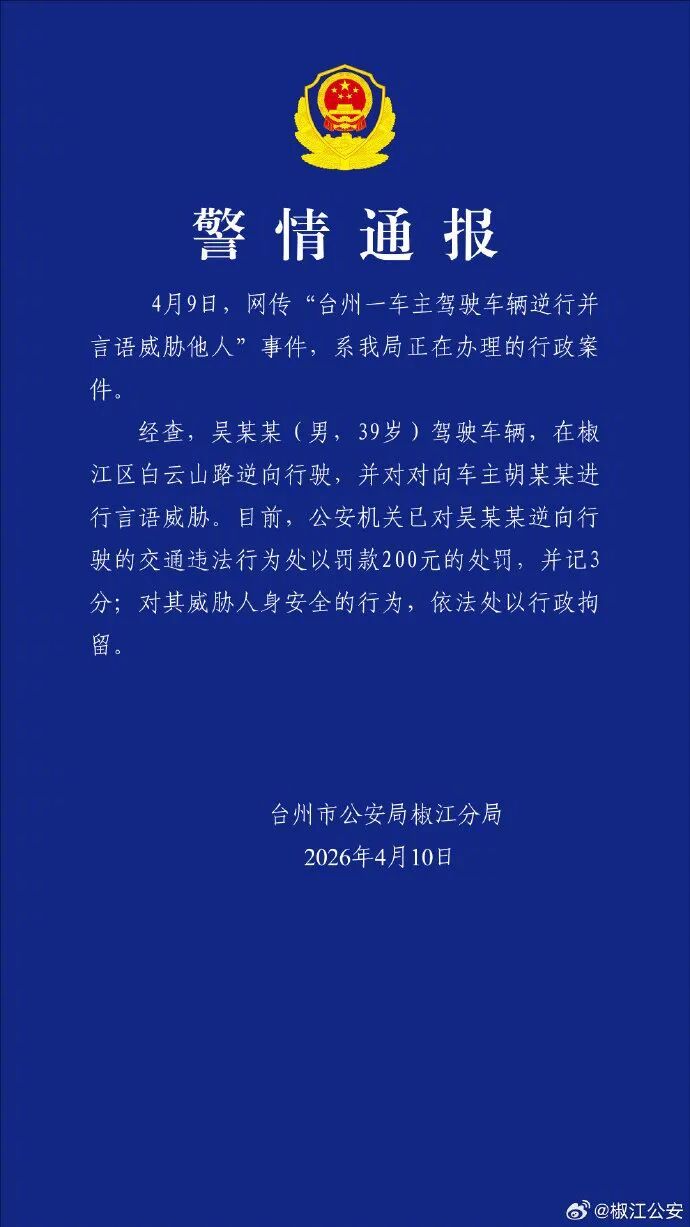 4月10日,浙江台州市公安局椒江区分局发布警情通报:4月9日,网传“台州一车主驾驶车辆逆行并言语威胁他人”事件,系我局正在办理的行政案件。经查,吴某某(男,39岁)驾驶车辆,在椒江区白云山路逆向行驶,并对向车主胡某某进行言语威胁。目前,公安机关已对吴某某逆向行驶的交通违法行为处以罚款200元的处罚,并记3分;对其威胁人身安全的行为,依法处以行政拘留。