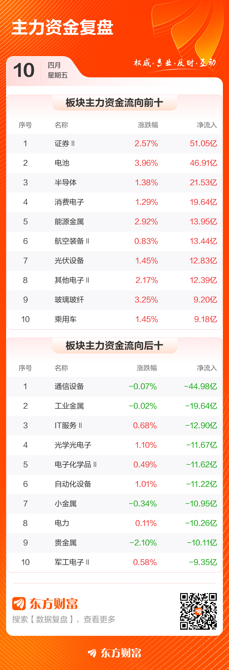 4月10日,沪指涨0.51%,深成指涨2.24%,创业板指涨3.78%。两市成交额2.32万亿,较上个交易日放量1888亿。数据显示,今日大盘主力资金净流入14.59亿。证券Ⅱ、电池、半导体等板块主力资金流入排名居前,其中证券Ⅱ净流入51.05亿元。