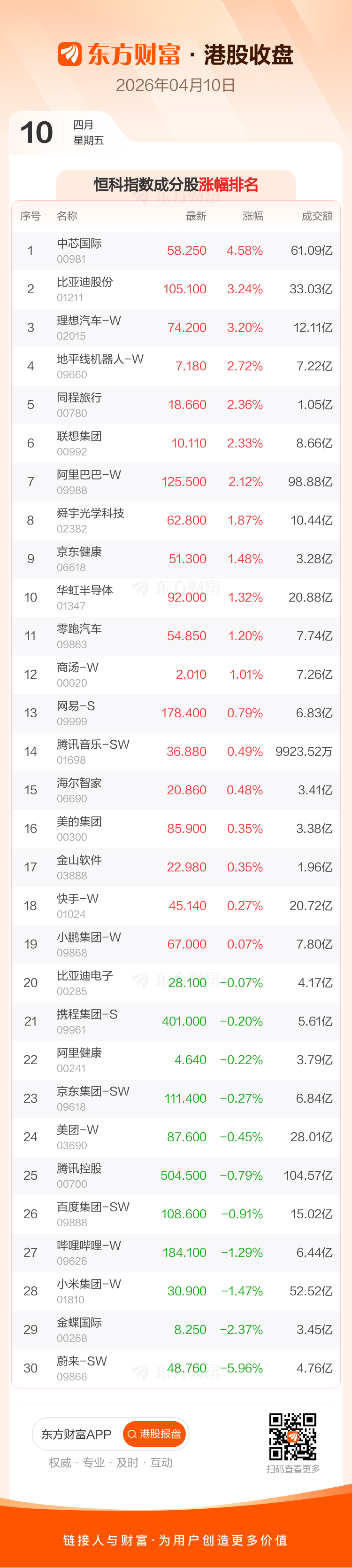 港股4月10日收盘走高,恒生指数收报25893.54点,涨141.14点,涨幅0.55%;恒生科技指数收报4860.26点,涨38.59点,涨幅0.8%。恒生指数成分股中宁德时代、中芯国际、万洲国际涨幅居前,康师傅控股、中国宏桥、华润万象生活跌幅靠前。恒生科技指数成分股中中芯国际、比亚迪股份、理想汽车-W涨幅居前,蔚来-SW、金蝶国际、小米集团-W跌幅靠前。
