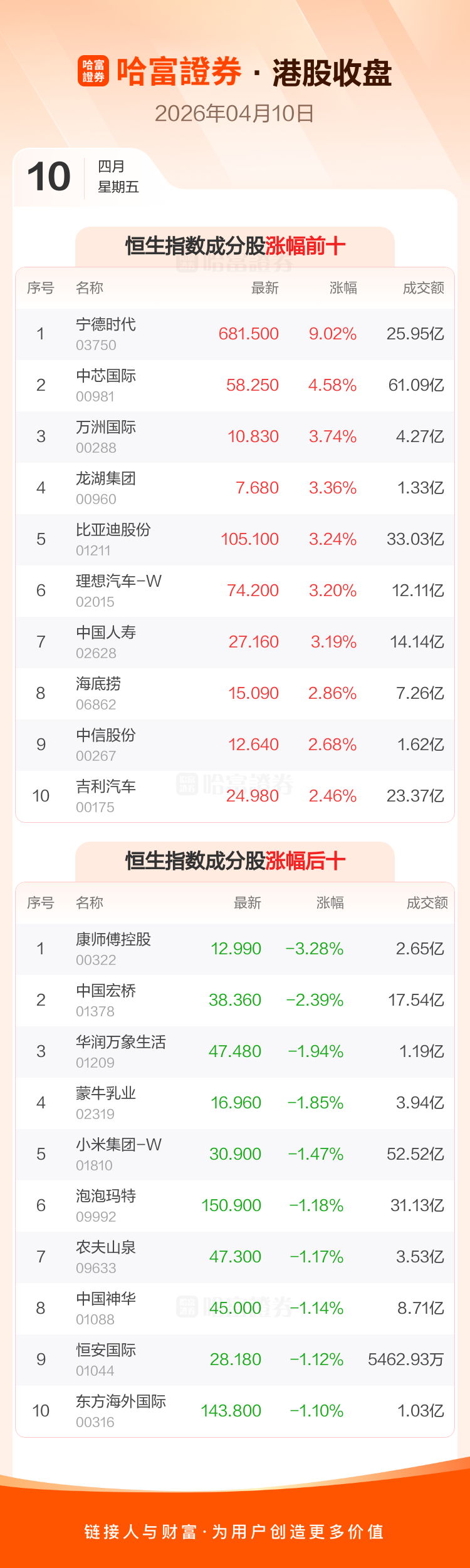 港股4月10日收盘走高,恒生指数收报25893.54点,涨141.14点,涨幅0.55%;恒生科技指数收报4860.26点,涨38.59点,涨幅0.8%。恒生指数成分股中宁德时代、中芯国际、万洲国际涨幅居前,康师傅控股、中国宏桥、华润万象生活跌幅靠前。恒生科技指数成分股中中芯国际、比亚迪股份、理想汽车-W涨幅居前,蔚来-SW、金蝶国际、小米集团-W跌幅靠前。