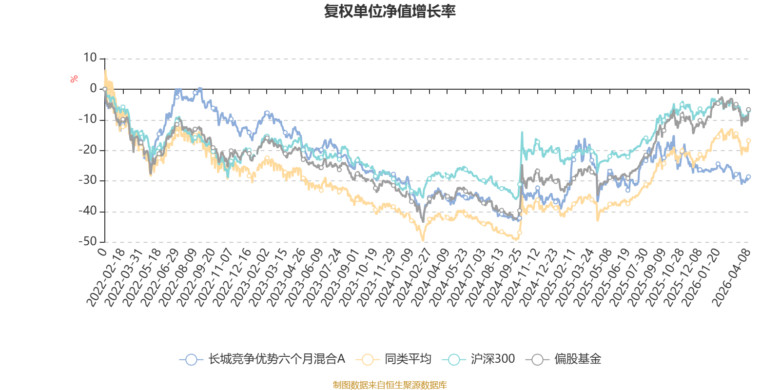 截至4月8日,长城竞争优势六个月混合A近三个月复权单位净值增长率为-2.83%,位于同类可比基金426/621;近半年复权单位净值增长率为-15.24%,位于同类可比基金593/621;近一年复权单位净值增长率为12.01%,位于同类可比基金567/618;近三年复权单位净值增长率为-18.73%,位于同类可比基金530/559。