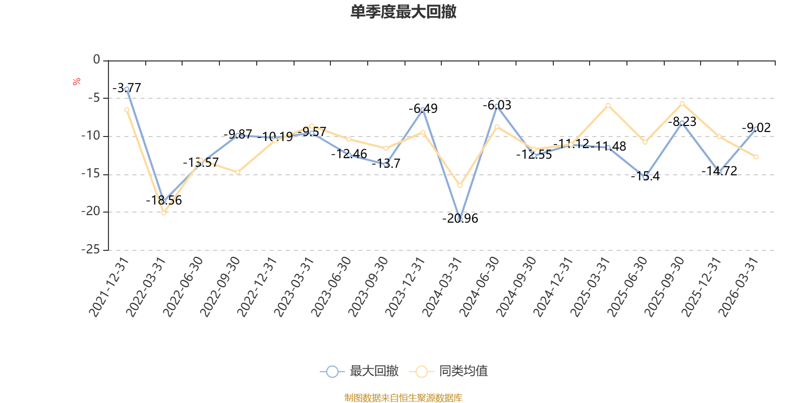截至4月8日,基金近三年最大回撤为35.77%,同类可比基金排名351/550。单季度最大回撤出现在2024年一季度,为20.96%。