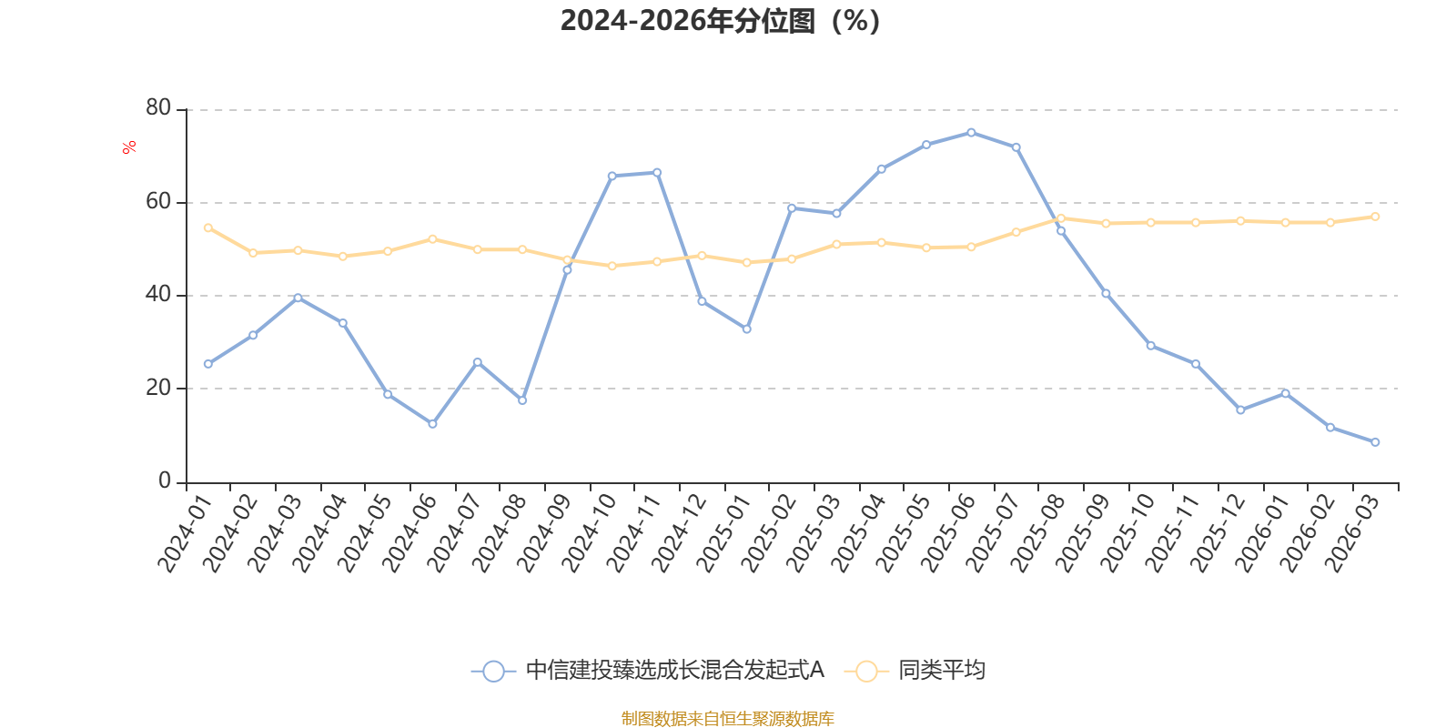 通过所选区间该基金净值增长率分位图,可以观察该基金与同类基金业绩比较情况。图为坐标原点到区间内某时点的净值增长率在同类基金中的分位数。
