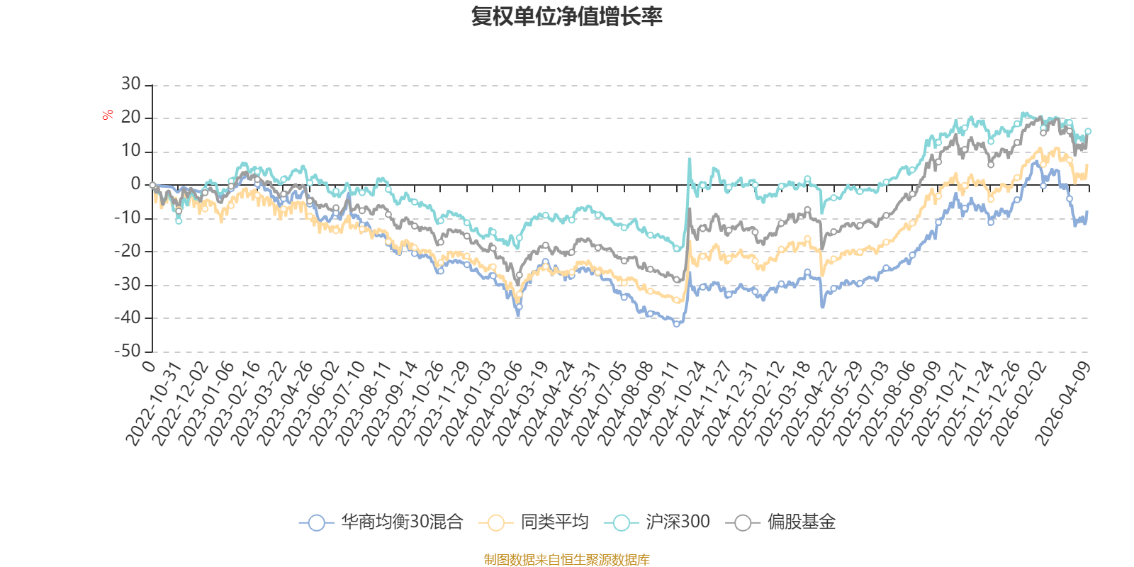 截至4月8日,华商均衡30混合近三个月复权单位净值增长率为-7.08%,位于同类可比基金543/621;近半年复权单位净值增长率为-4.36%,位于同类可比基金477/621;近一年复权单位净值增长率为46.23%,位于同类可比基金252/618;近三年复权单位净值增长率为-6.11%,位于同类可比基金466/559。