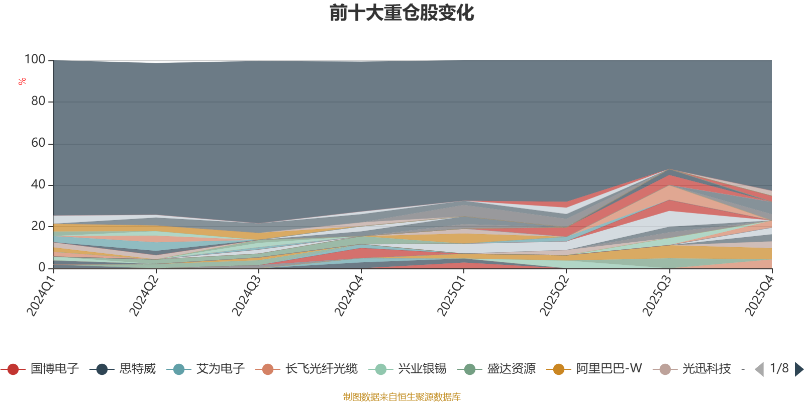 截至2025年末,基金十大重仓股分别是浪潮信息、阿里巴巴-W、长飞光纤光缆、锐捷网络、沪电股份、光迅科技、航天电子、海光信息、华润微、金风科技。