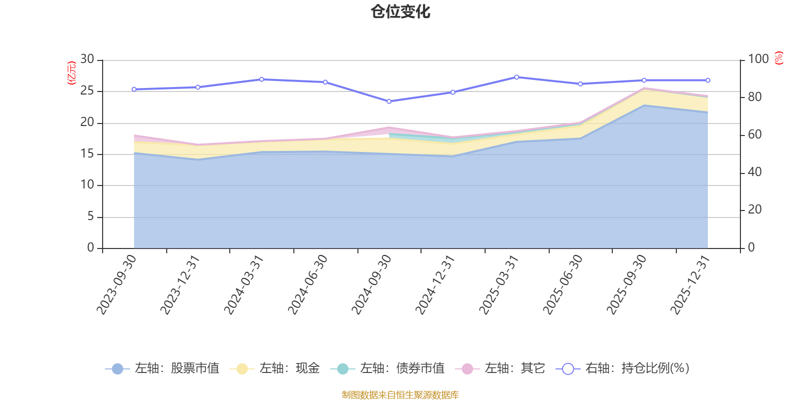 据定期报告数据统计,成立以来平均股票仓位为86.54%,同类平均为87.64%。2025年一季度末基金达到90.9%的最高仓位,2024年三季度末最低,为78.01%。