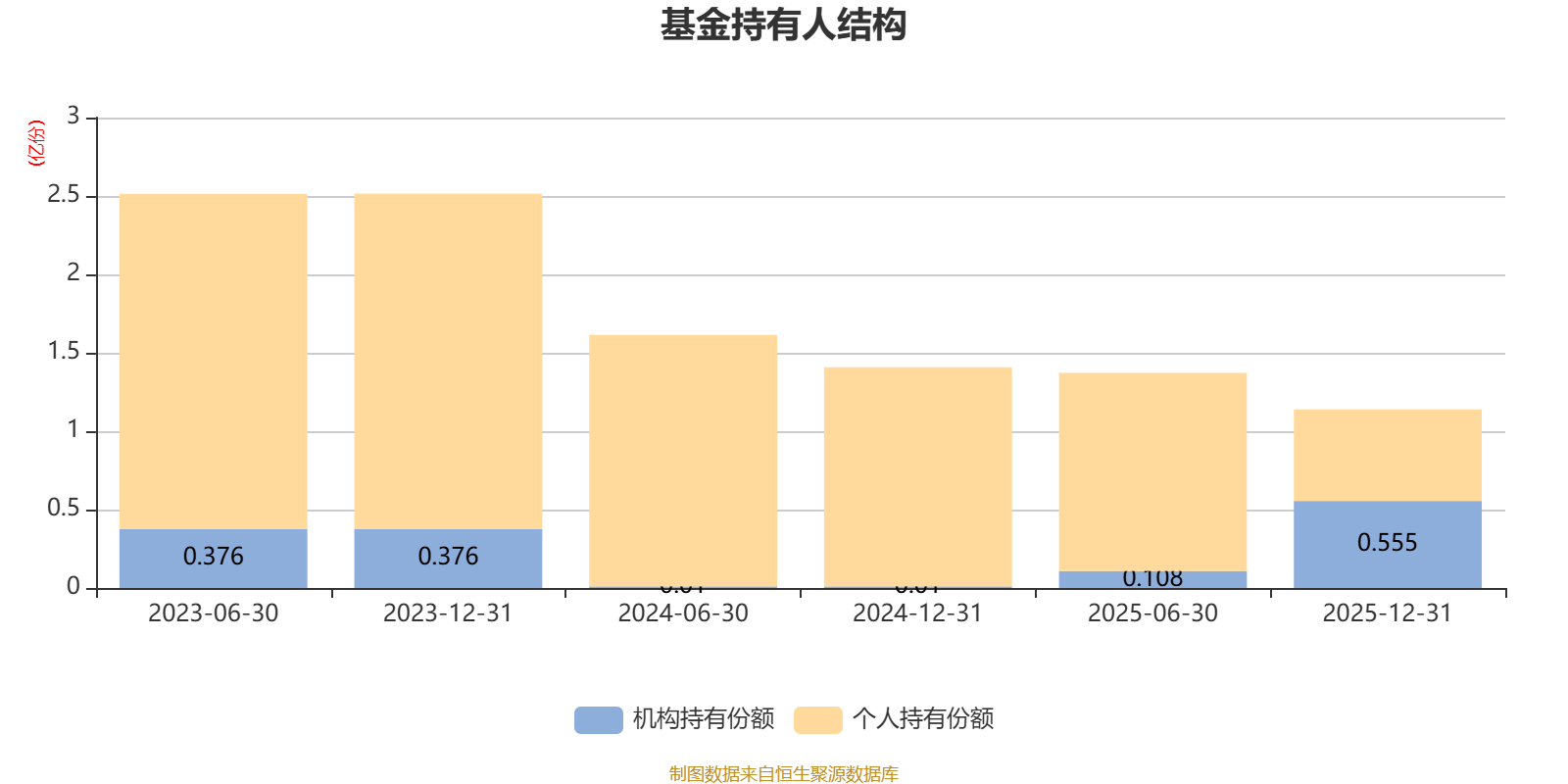 截至2025年12月31日,基金持有人共计985户,合计持有1.14亿份。其中管理人员工持有26.41万份,占比0.23%,机构持有份额占比48.71%,个人投资者占比51.29%。