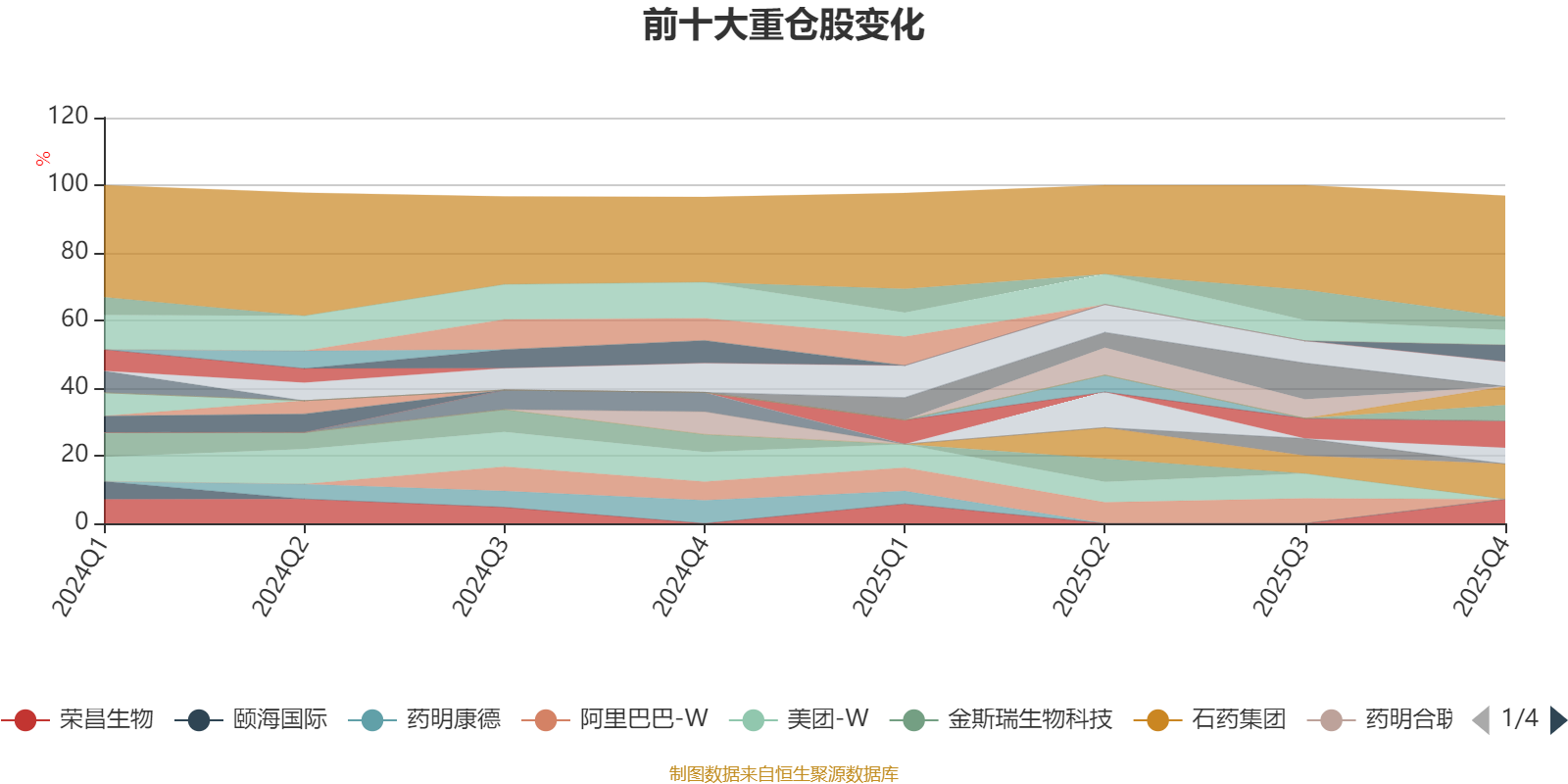 该基金持股集中度较高,近2年前十大重仓股集中度长期超过60%。截至2025年末,基金十大重仓股分别是石药集团、小鹏集团-W、药明生物、荣昌生物、盐湖股份、腾讯控股、信达生物、新诺威、思摩尔国际、中芯国际。