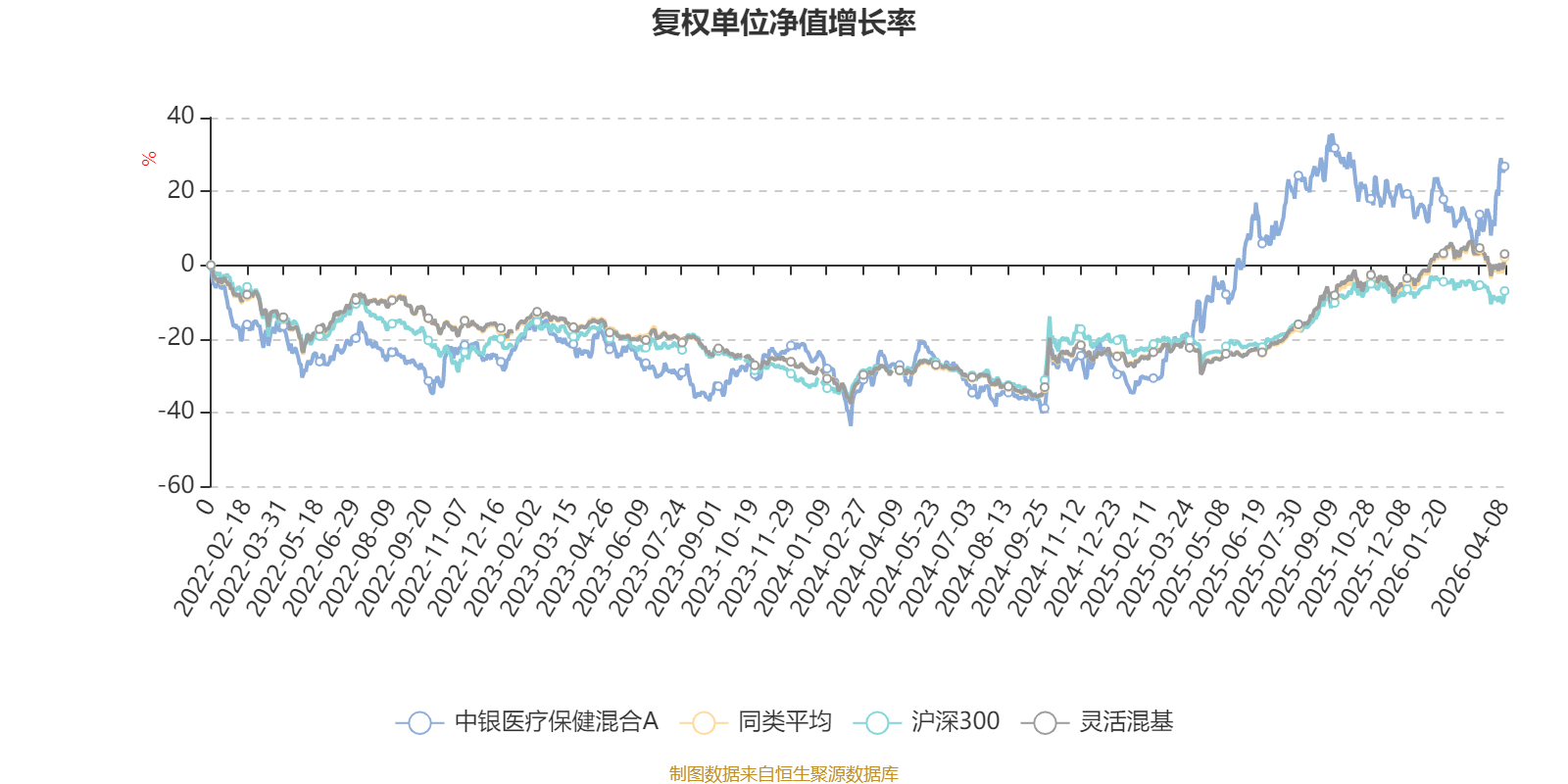 截至4月8日,中银医疗保健混合A近三个月复权单位净值增长率为4.99%,位于同类可比基金222/1287;近半年复权单位净值增长率为-1.39%,位于同类可比基金950/1286;近一年复权单位净值增长率为54.14%,位于同类可比基金354/1286;近三年复权单位净值增长率为58.20%,位于同类可比基金104/1286。