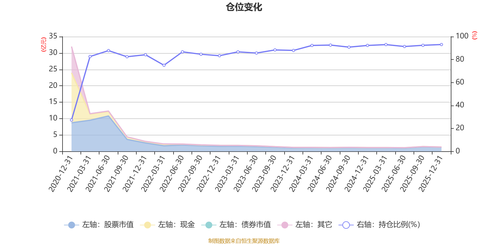 据定期报告数据统计,近三年平均股票仓位为90.56%,同类平均为85.83%。2025年末基金达到93.08%的最高仓位,2020年末最低,为27.35%。