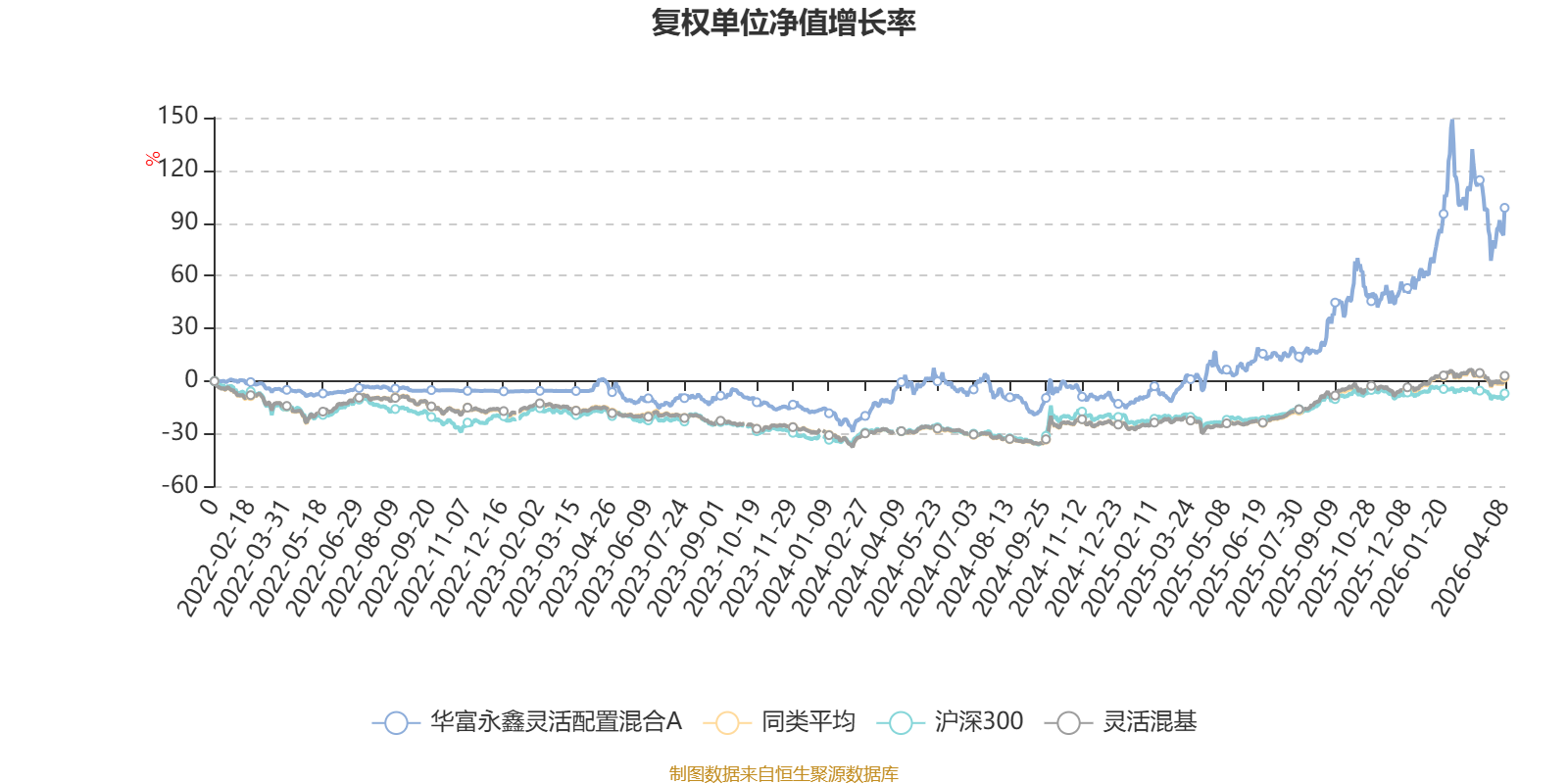 截至4月8日,华富永鑫灵活配置混合A近三个月复权单位净值增长率为18.77%,位于同类可比基金24/1287;近半年复权单位净值增长率为27.68%,位于同类可比基金42/1286;近一年复权单位净值增长率为109.53%,位于同类可比基金59/1286;近三年复权单位净值增长率为102.57%,位于同类可比基金30/1286。