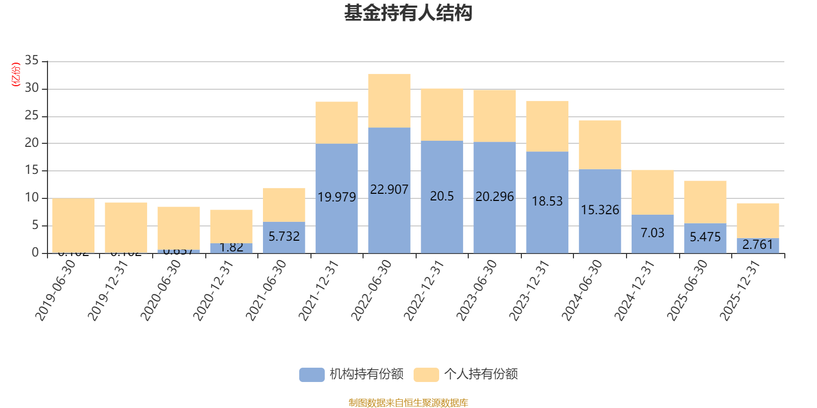 截至2025年12月31日,基金持有人共计3.22万户,合计持有9.09亿份。其中管理人员工持有72.44万份,占比0.08%,机构持有份额占比30.38%,个人投资者占比69.62%。