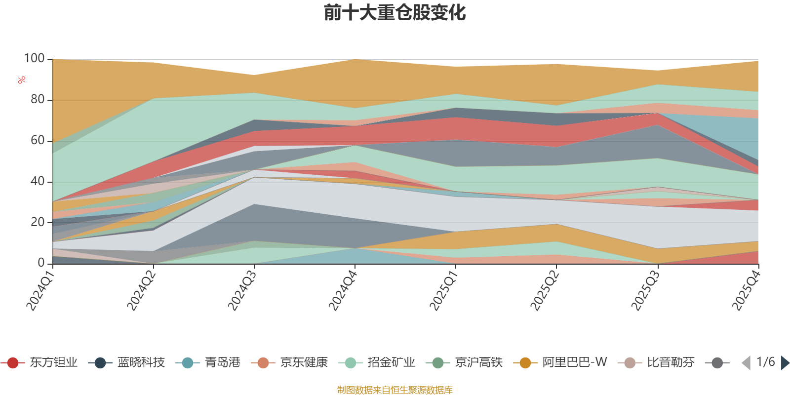 该基金持股集中度较高。截至2025年末,基金十大重仓股分别是紫金黄金国际、宁德时代、腾讯控股、紫金矿业、东方钽业、藏格矿业、阿里巴巴-W、恒瑞医药、招商银行、赤峰黄金。