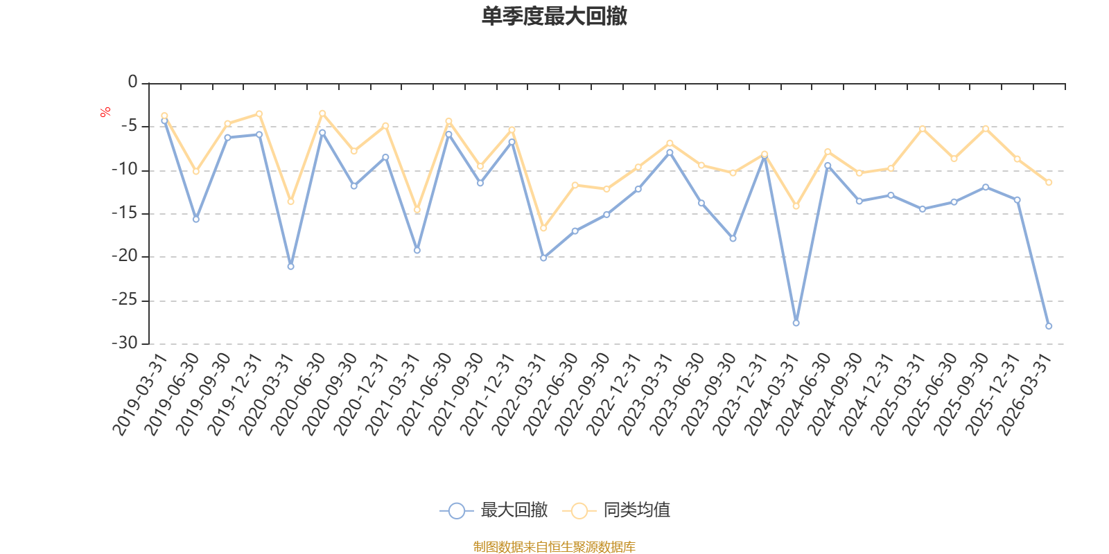 截至4月8日,基金近三年最大回撤为44.46%,同类可比基金排名1127/1264。单季度最大回撤出现在2026年一季度,为27.96%。