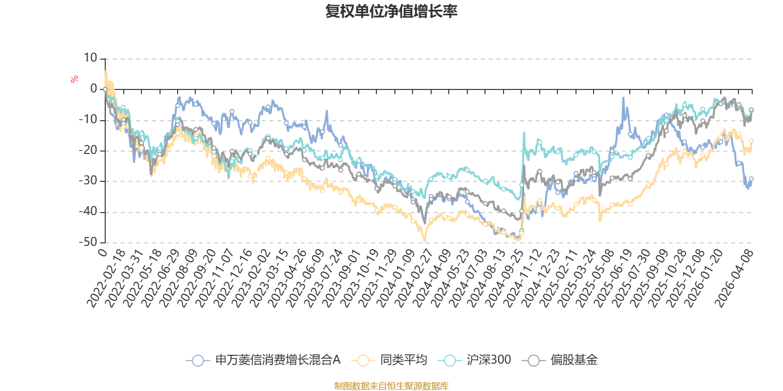 截至4月8日,申万菱信消费增长混合A近三个月复权单位净值增长率为-12.23%,位于同类可比基金601/621;近半年复权单位净值增长率为-18.28%,位于同类可比基金606/621;近一年复权单位净值增长率为4.09%,位于同类可比基金606/618;近三年复权单位净值增长率为-20.00%,位于同类可比基金534/559。