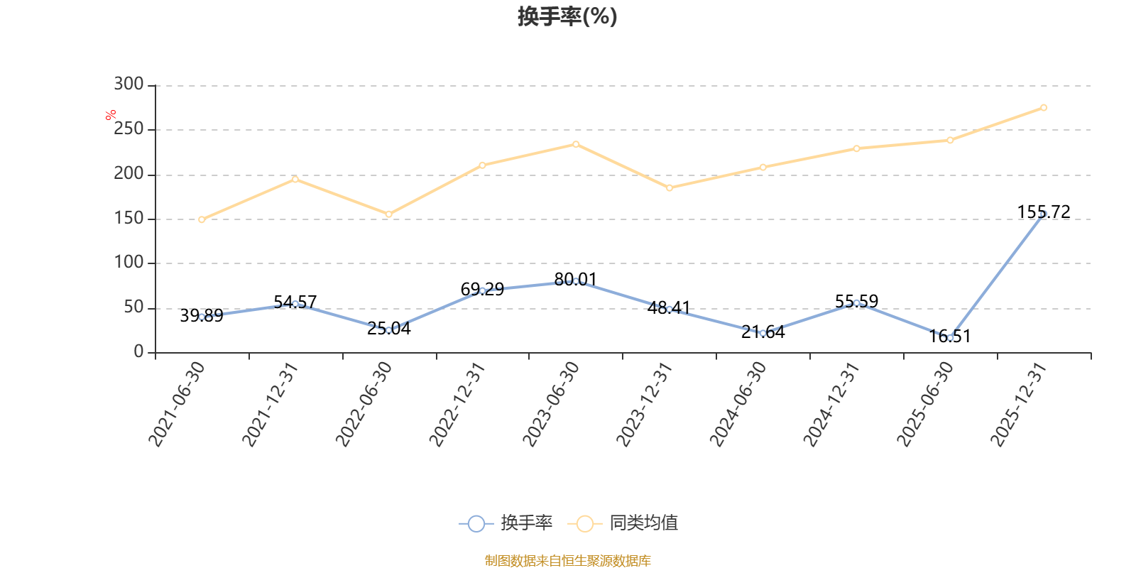 截至2025年12月31日,基金最近一年换手率约163.39%,持续低于同类均值。