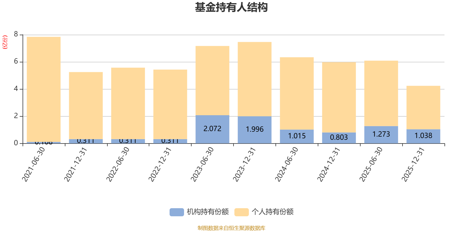 截至2025年12月31日,基金持有人共计1.28万户,合计持有4.24亿份。其中管理人员工持有268.07万份,占比0.63%,机构持有份额占比24.51%,个人投资者占比75.49%。