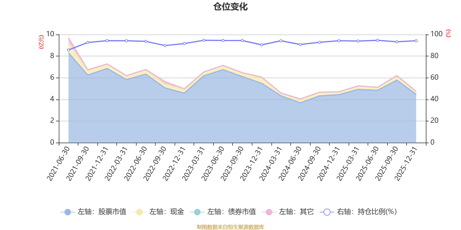 据定期报告数据统计,近三年平均股票仓位为93.51%,同类平均为86.9%。2023年一季度末基金达到94.66%的最高仓位,2021年上半年末最低,为85.72%。