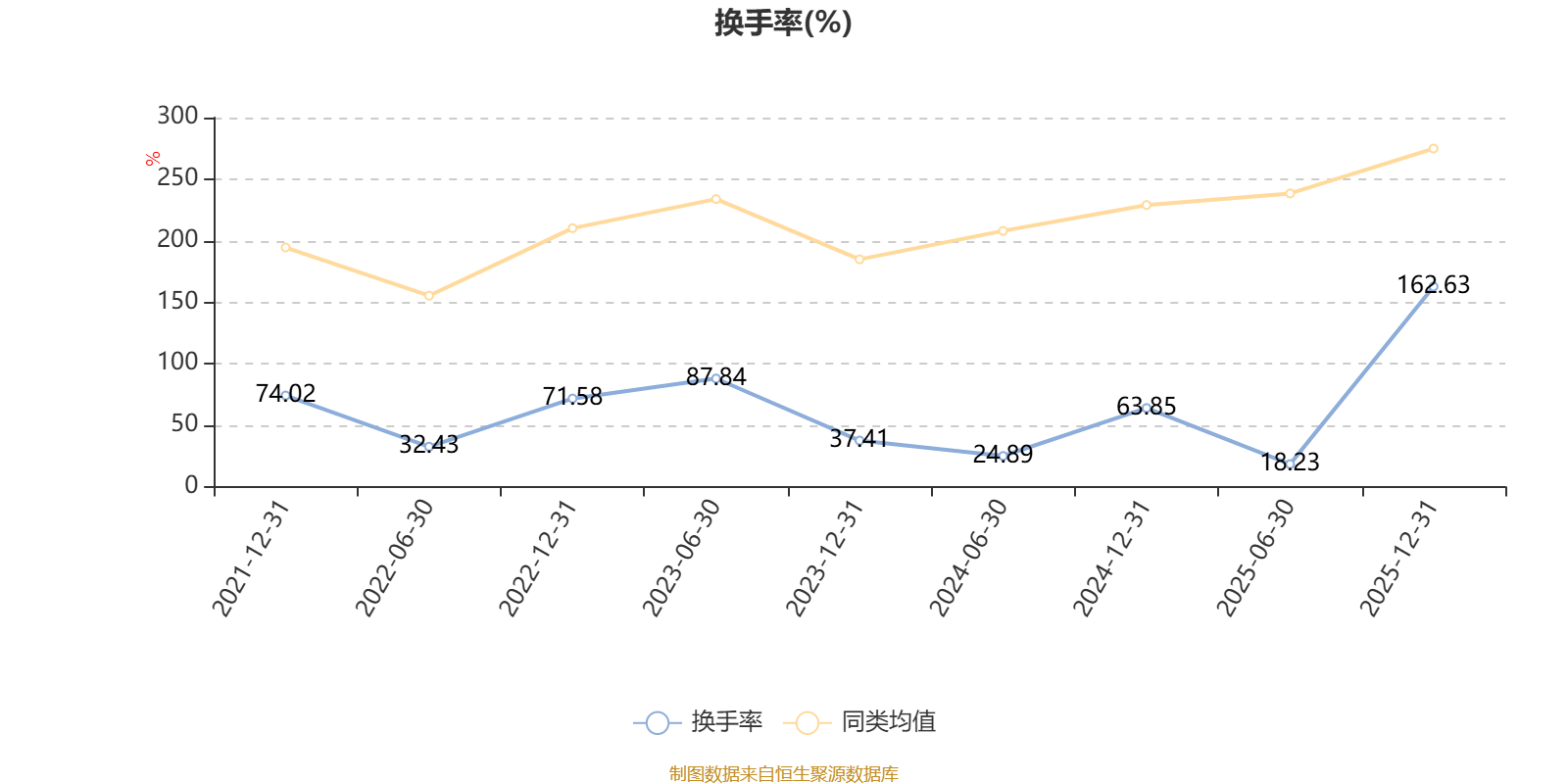 截至2025年12月31日,基金最近一年换手率约184.93%,持续低于同类均值。