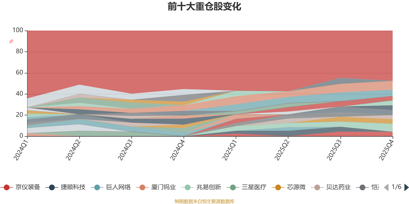 截至2025年末,基金十大重仓股分别是北方华创、兆易创新、华峰测控、中微公司、寒武纪、艾迪药业、芯源微、京仪装备、北京君正、贝达药业。