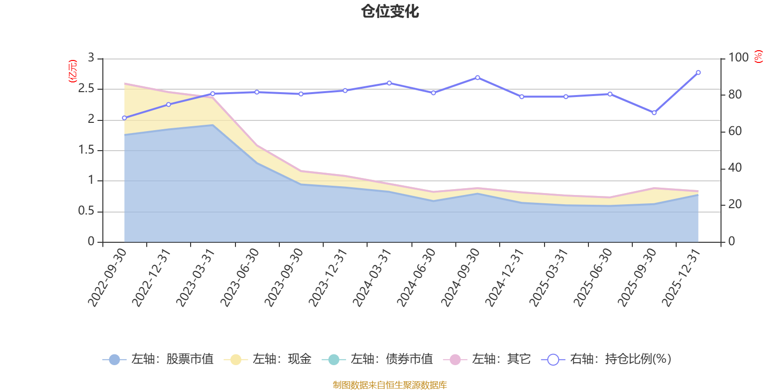 据定期报告数据统计,近三年平均股票仓位为82.1%,同类平均为84.04%。2025年末基金达到92.38%的最高仓位,2022年三季度末最低,为67.64%。
