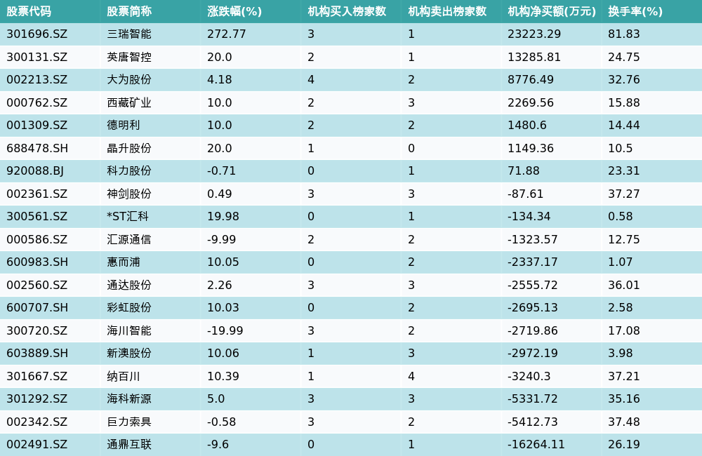 南财智讯4月10日电,盘后数据显示,因当日异动登上龙虎榜的个股中,19只沪深A股龙虎榜出现了机构的身影,机构合计净买入5182.54万元,具体来看,机构净买入7只个股,净卖出12只个股。其中,机构净买入前三分别为三瑞智能(301696.SZ)、英唐智控(300131.SZ)与大为股份(002213.SZ),详情见下图:机构净卖出的个股中,前三分别为通鼎互联(002491.SZ)、巨力索具(002342.SZ)与海科新源(301292.SZ)。
