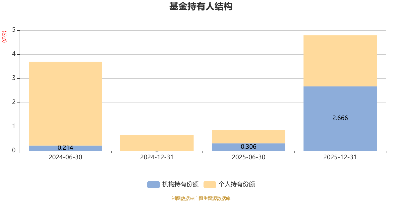 截至2025年12月31日,基金持有人共计6367户,合计持有4.79亿份。其中管理人员工持有124.32万份,占比0.26%,机构持有份额占比55.69%,个人投资者占比44.31%。