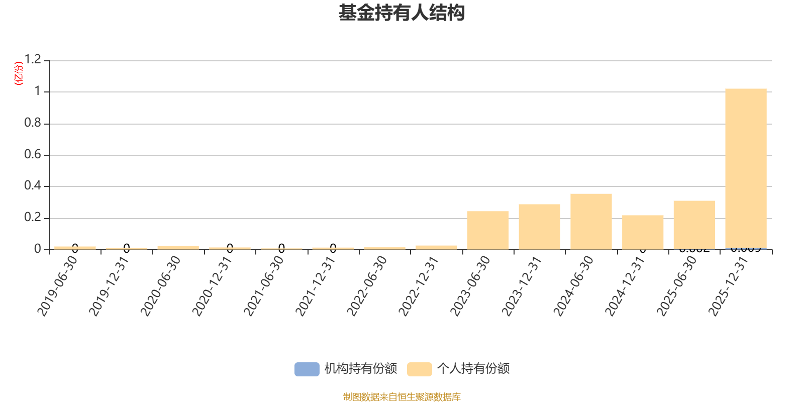 截至2025年12月31日,基金持有人共计7620户,合计持有1.02亿份。其中管理人员工持有2.64万份,占比0.03%,机构持有份额占比0.84%,个人投资者占比99.16%。