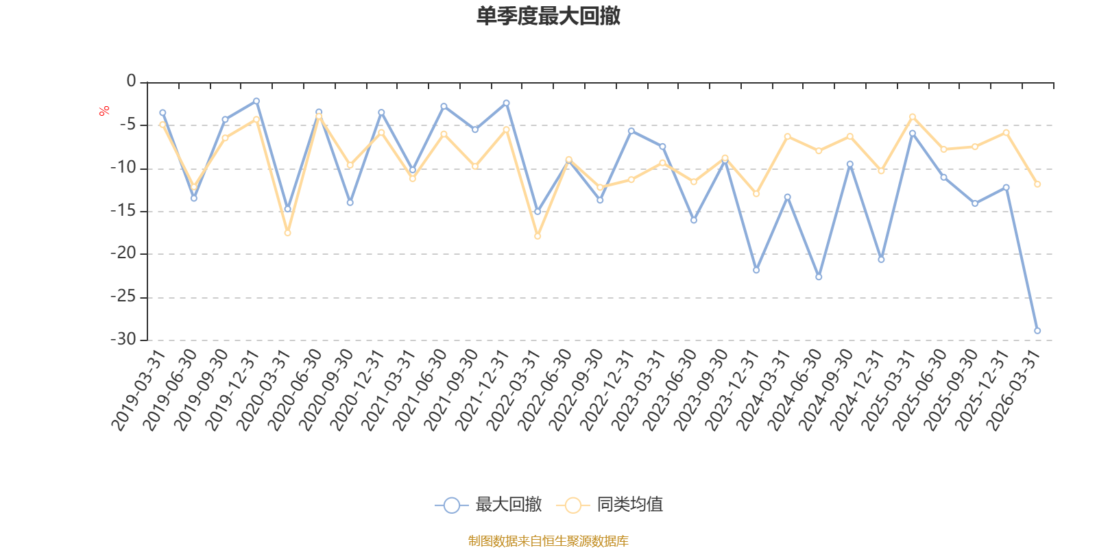 截至4月8日,基金近三年最大回撤为42.53%,同类可比基金排名10/11。单季度最大回撤出现在2026年一季度,为28.91%。