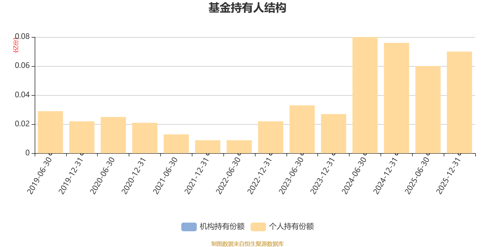 截至2025年12月31日,基金持有人共计1333户,合计持有698.2万份。其中管理人员工持有2.49万份,占比0.36%,机构持有份额占比0.01%,个人投资者占比99.99%。
