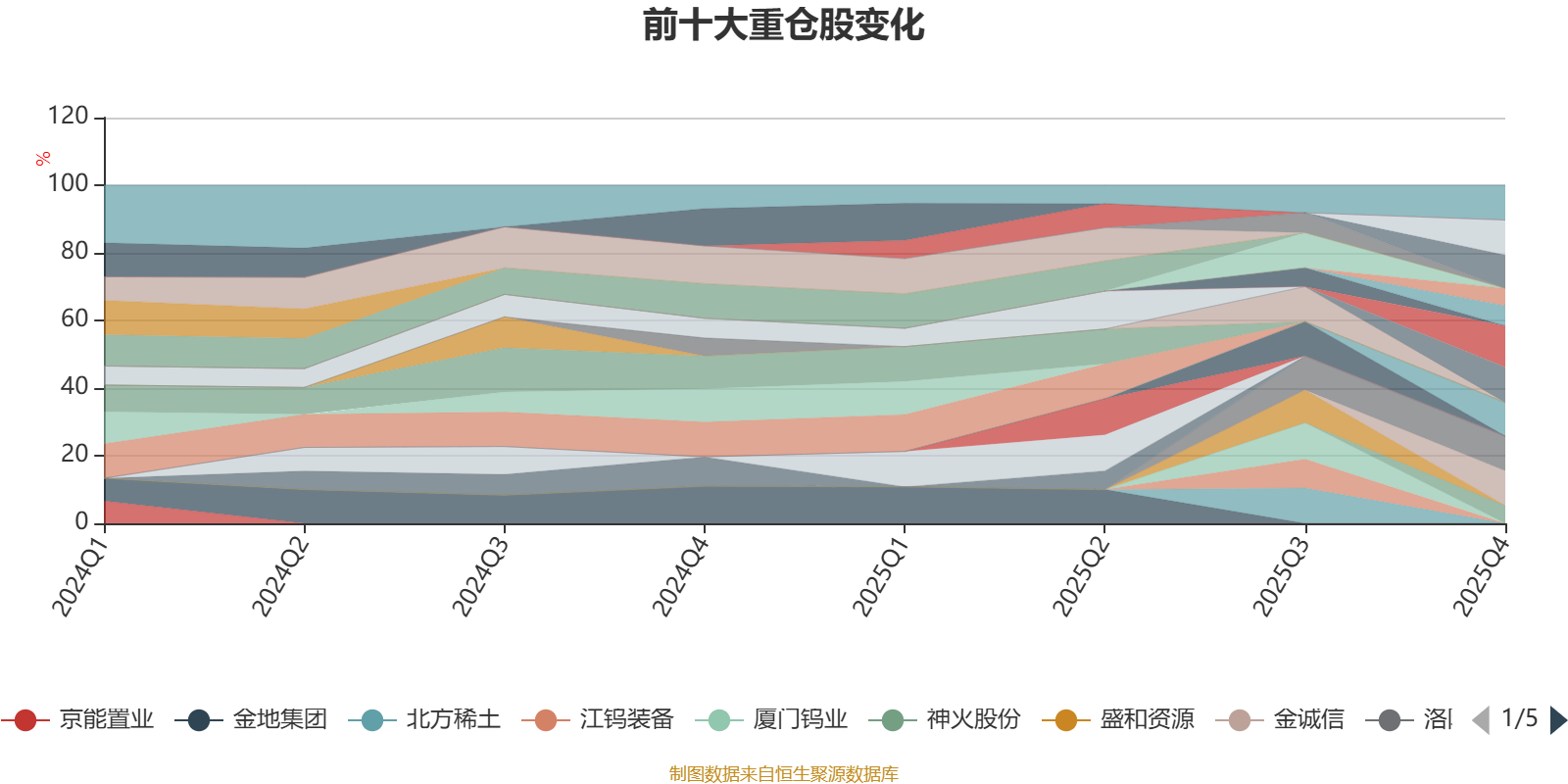 该基金持股集中度较高,近2年前十大重仓股集中度长期超过60%。截至2025年末,基金十大重仓股分别是江西铜业、中孚实业、中国铝业、金诚信、洛阳钼业、藏格矿业、云南铜业、百通能源、神火股份、翔鹭钨业。