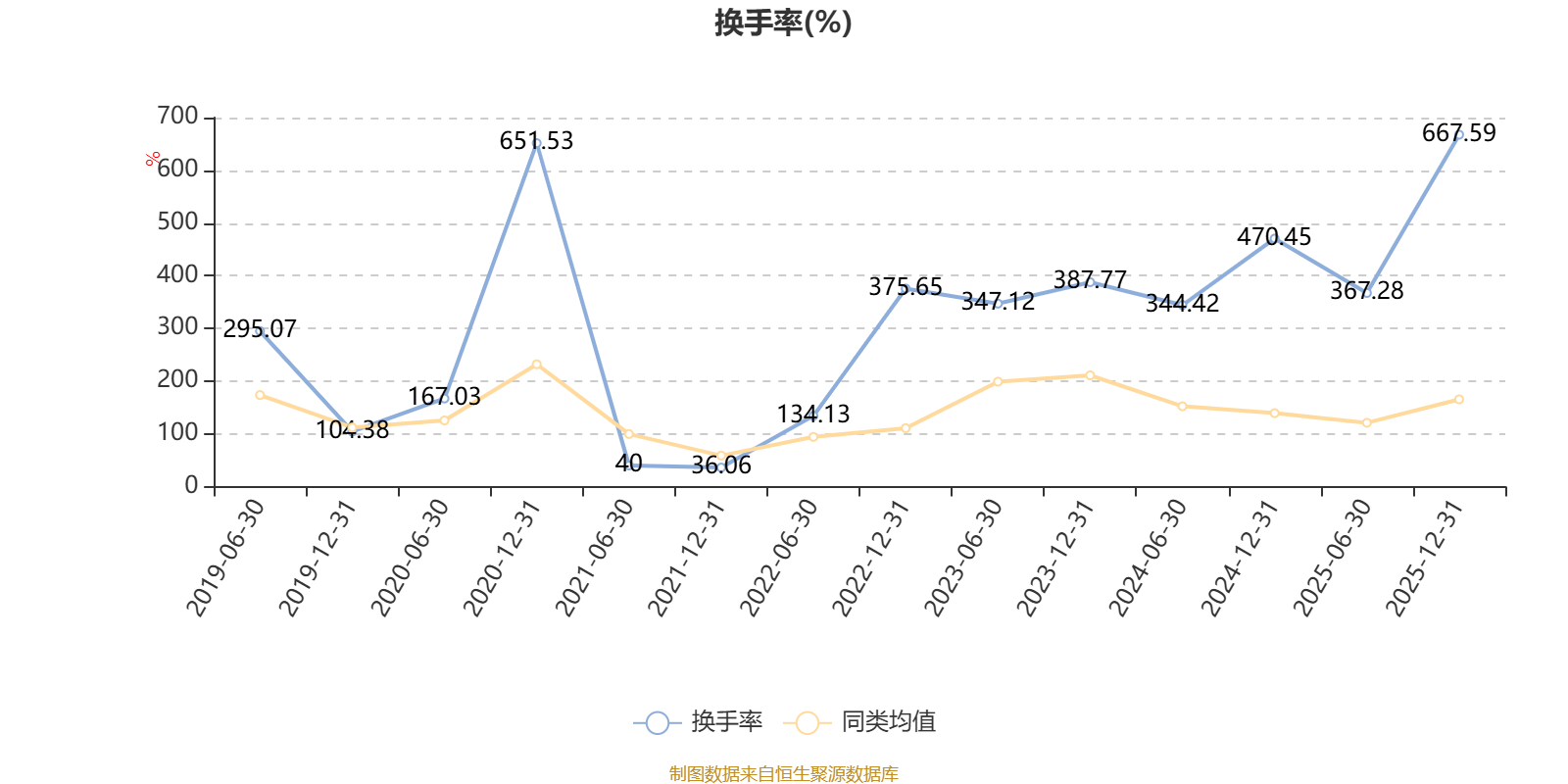 截至2025年12月31日,基金最近一年换手率约1055.62%,持续4年高于同类均值。