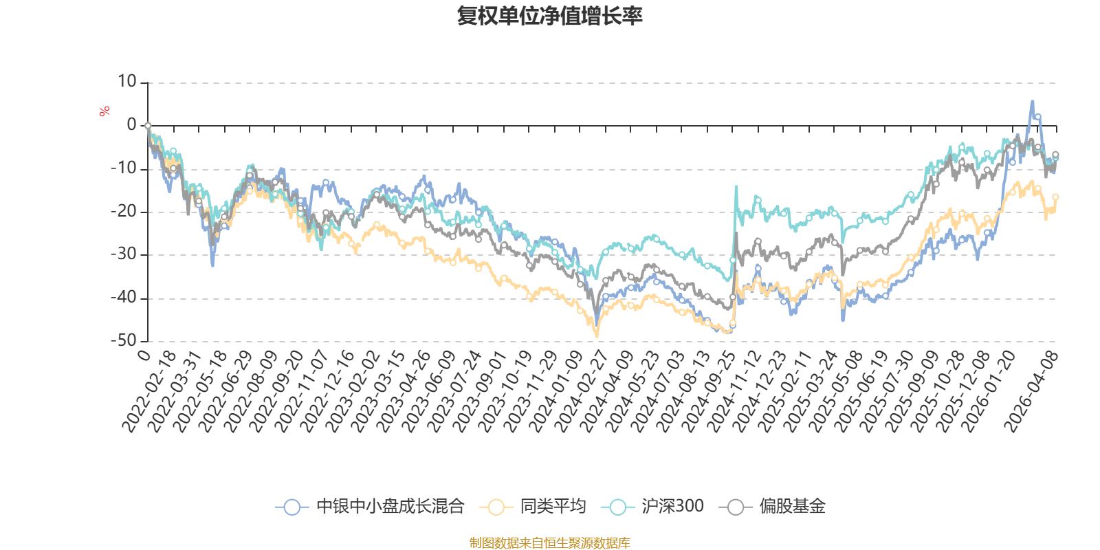 截至4月8日,中银中小盘成长混合近三个月复权单位净值增长率为4.43%,位于同类可比基金165/689;近半年复权单位净值增长率为22.21%,位于同类可比基金49/689;近一年复权单位净值增长率为69.15%,位于同类可比基金102/685;近三年复权单位净值增长率为7.47%,位于同类可比基金241/417。