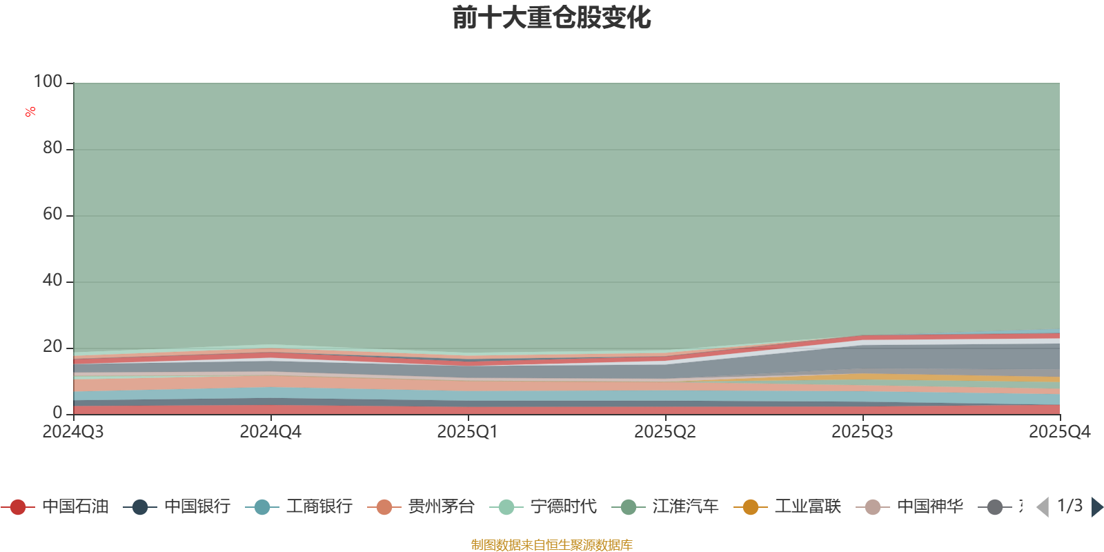 截至2025年末,基金十大重仓股分别是农业银行、工商银行、中国石油、东山精密、江淮汽车、贵州茅台、邮储银行、中国人寿、工业富联、国泰海通。