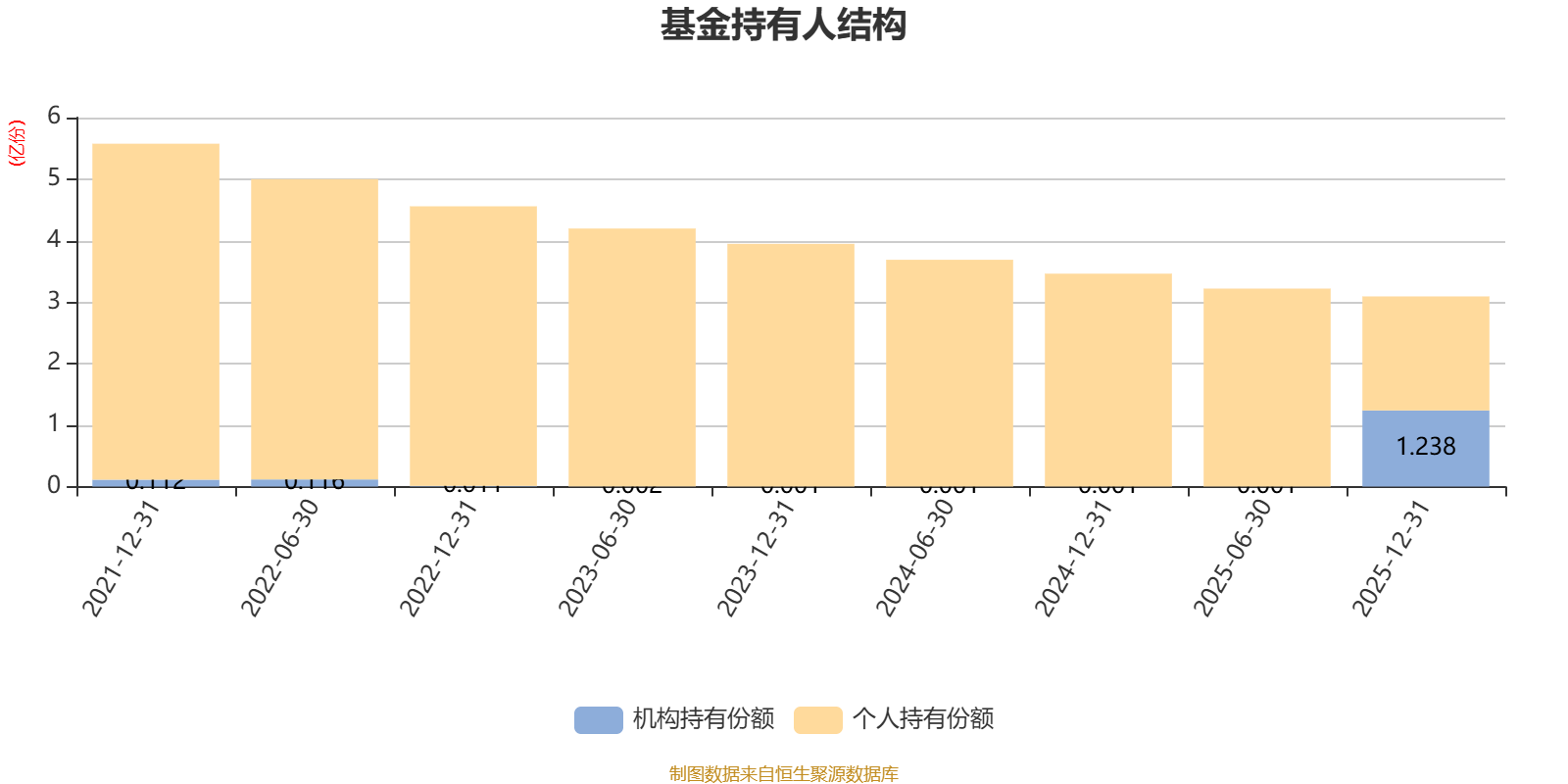 截至2025年12月31日,基金持有人共计4389户,合计持有3.09亿份。其中管理人员工持有426.08万份,占比1.38%,机构持有份额占比40.04%,个人投资者占比59.96%。