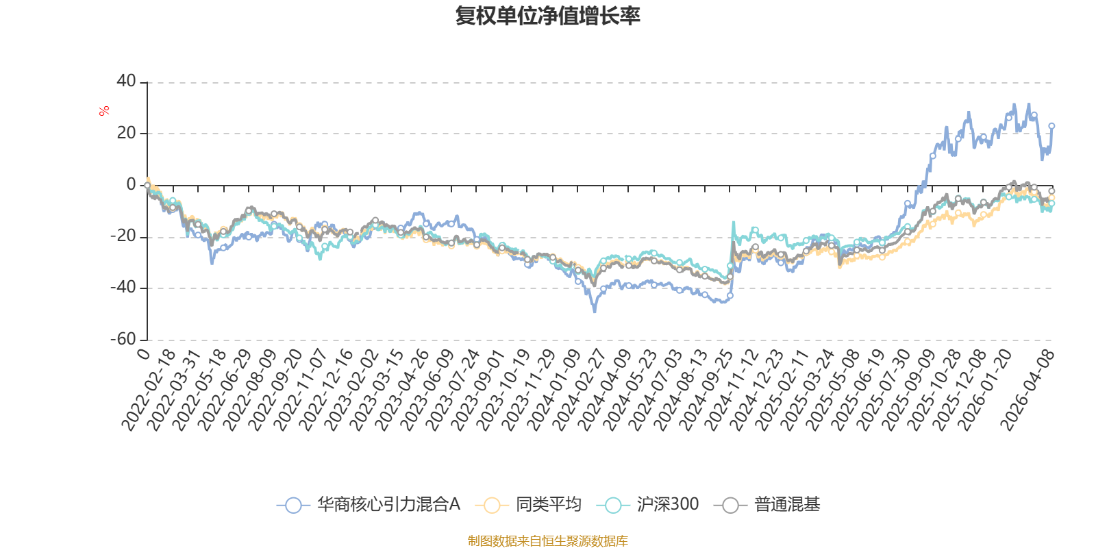 截至4月8日,华商核心引力混合A近三个月复权单位净值增长率为0.62%,位于同类可比基金57/134;近半年复权单位净值增长率为0.69%,位于同类可比基金86/134;近一年复权单位净值增长率为76.05%,位于同类可比基金5/134;近三年复权单位净值增长率为37.66%,位于同类可比基金20/126。