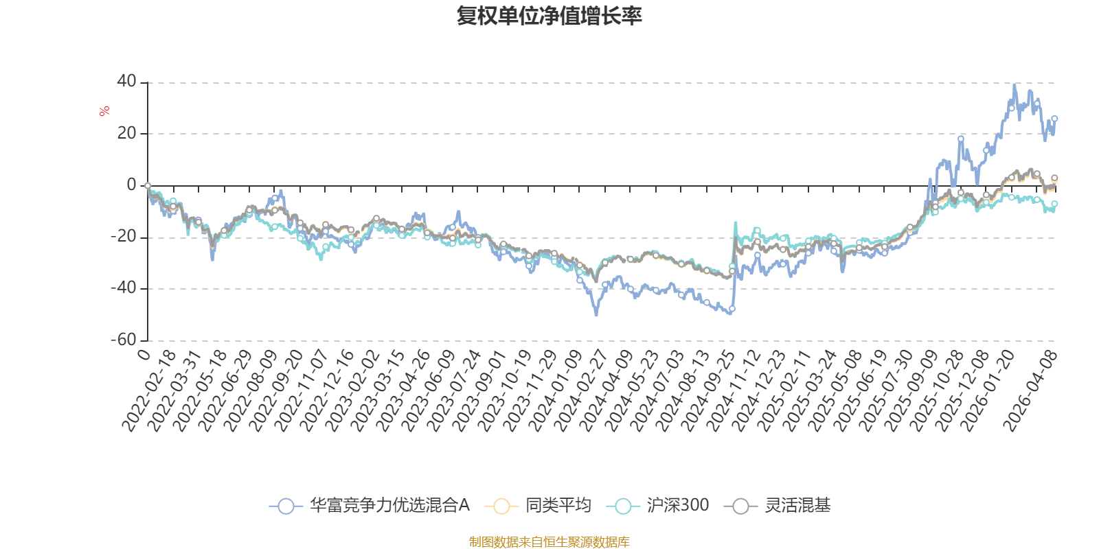 截至4月8日,华富竞争力优选混合A近三个月复权单位净值增长率为0.88%,位于同类可比基金536/1287;近半年复权单位净值增长率为16.23%,位于同类可比基金115/1286;近一年复权单位净值增长率为89.95%,位于同类可比基金112/1286;近三年复权单位净值增长率为40.28%,位于同类可比基金212/1286。